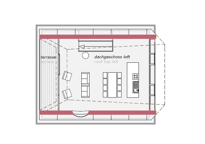 • Dachgeschoß:  Wohnraumloft mit großem Essbereich, Küche, Kamin und Dachterrasse.